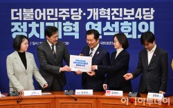 정청래 더불어민주당 대표가 12일 국회에서 열린 더불어민주당-개혁진보4당 정지개혁 연석회의에서 개혁진보4당 대표들부터 공동요구안을 전달받고 있다. 왼쪽부터 용혜인 기본소득당 대표, 조국 조국혁신당 대표, 정 대표, 김재연 진보당 상임대표, 한창민 사회민주당 대표.