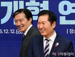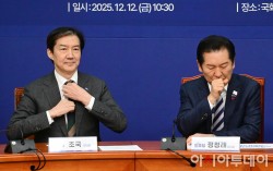 정청래 더불어민주당 대표와 조국 조국혁신당 대표가 12일 국회에서 열린 더불어민주당-개혁진보4당 정지개혁 연석회의에 밝게 웃으며 참석하고 있다.