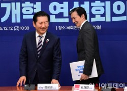 정청래 더불어민주당 대표와 조국 조국혁신당 대표가 12일 국회에서 열린 더불어민주당-개혁진보4당 정지개혁 연석회의에서 각각 목을 가다듬고 넥타이를 고쳐매고 있다.