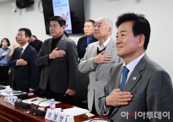 정동영 통일부 장관이 12일 국회 의원회관에서 열린 통일지향의 평화적 두 국가관계론 : 동북아평화공존포럼 토론회에서 국민의례를 하고 있다.