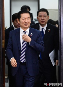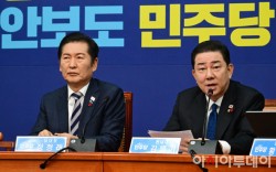 정청래 더불어민주당 대표와 김병기 원내대표가 12일 국회에서 열린 최고위원회의에 참석하고 있다.