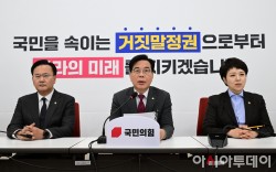 송언석 국민의힘 원내대표가 12일 국회에서 열린 현안 관련 기자간담회에 참석하고 있다.