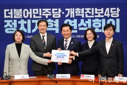 정청래 더불어민주당 대표가 12일 국회에서 열린 더불어민주당-개혁진보4당 정지개혁 연석회의에서 개혁진보4당 대표들부터 공동요구안을 전달받고 있다. 왼쪽부터 용혜인 기본소득당 대표, 조국 조국혁신당 대표, 정 대표, 김재연 진보당 상임대표, 한창민 사회민주당 대표.
